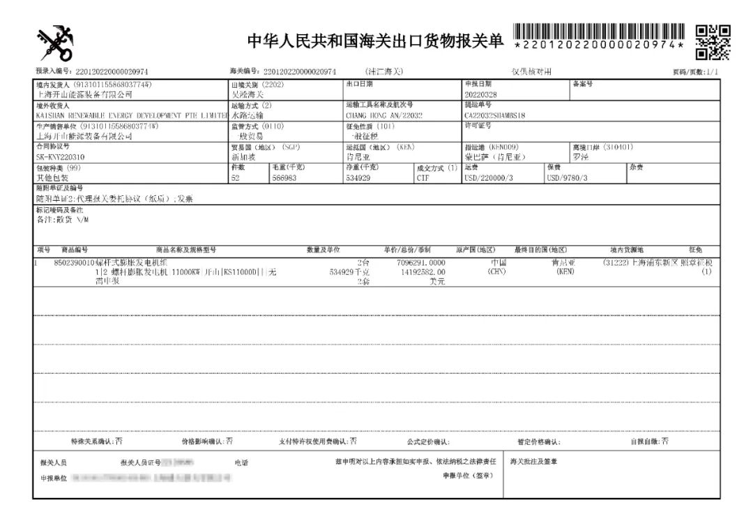 上周,肯尼亞Sosian地熱電站兩臺螺桿蒸汽膨脹發(fā)電機組啟運上海羅涇港。今天,完成海關(guān)報關(guān)作業(yè),不日就將裝船發(fā)運肯尼亞蒙巴薩港。